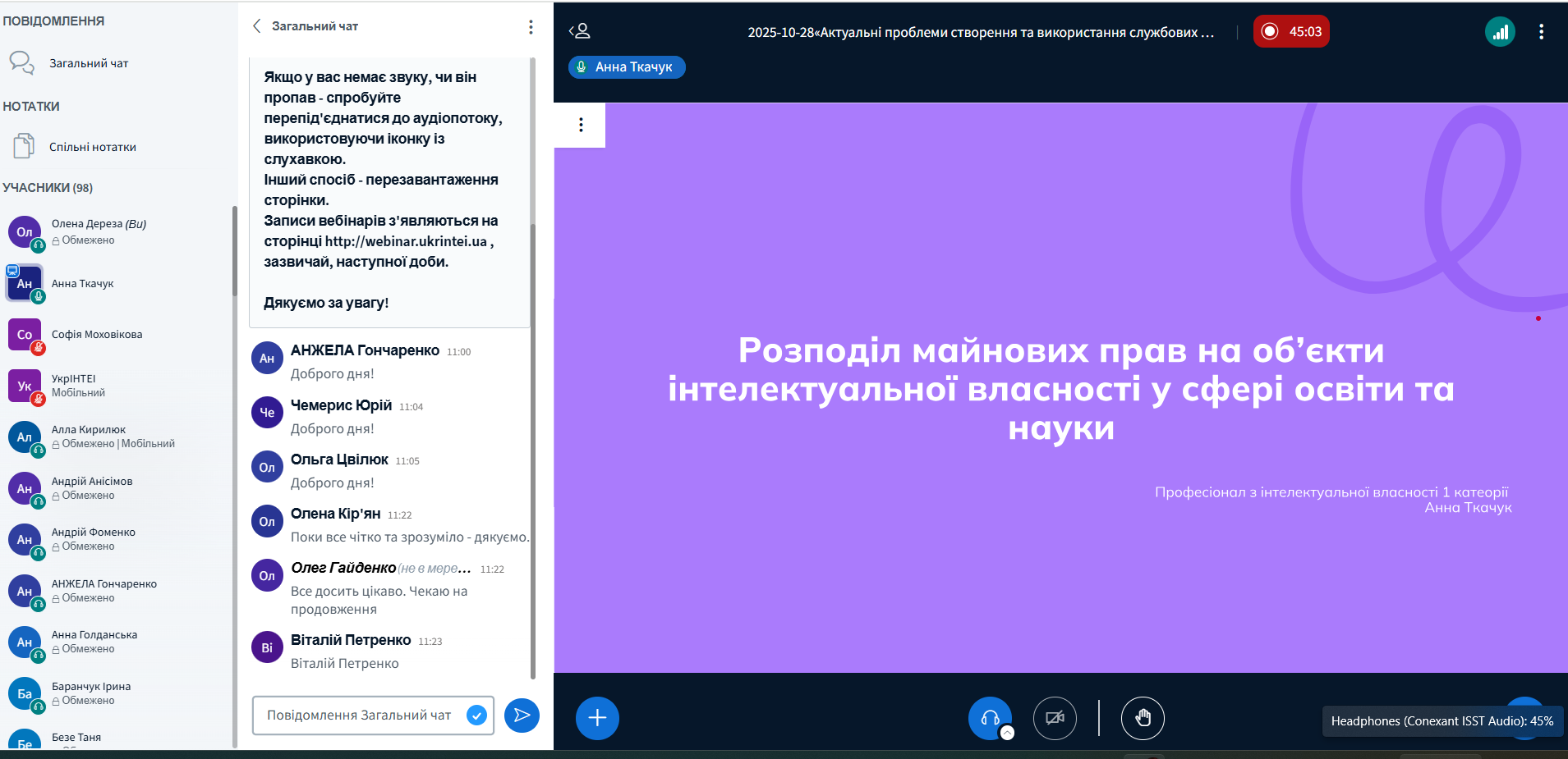 Спікерка Анна ТКАЧУК, професіонал з інтелектуальної власності 1 категорії відділу підготовки, перепідготовки та підвищення кваліфікацій департаменту «Академія інтелектуальної власності» УКРНОІВІ виступила з доповіддю:  «Розподіл майнових прав на об’єкти інтелектуальної власності у сфері освіти та науки».