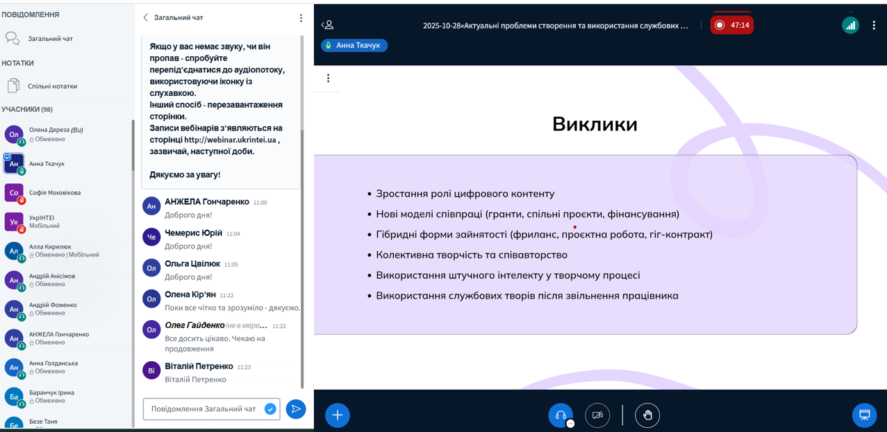28 жовтня 2025 р. доцент кафедри Олена Дереза взяла участь у науково-практичному семінарі «Актуальні проблеми створення та використання службових об’єктів права інтелектуальної власності у сфері освіти та науки», організованому Українським інститутом науково-технічної експертизи та інформації.