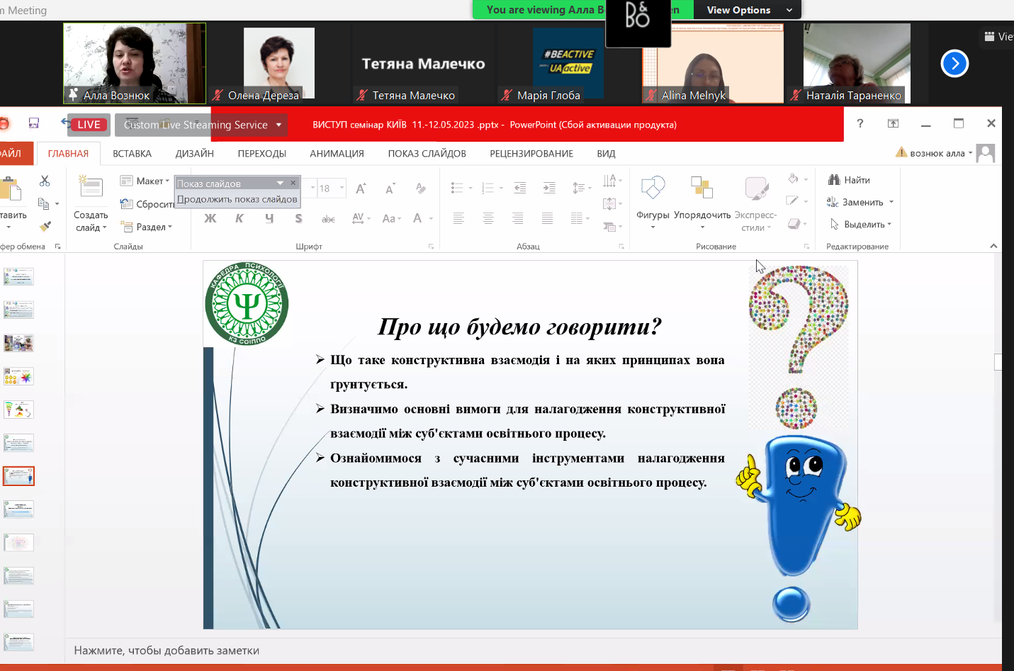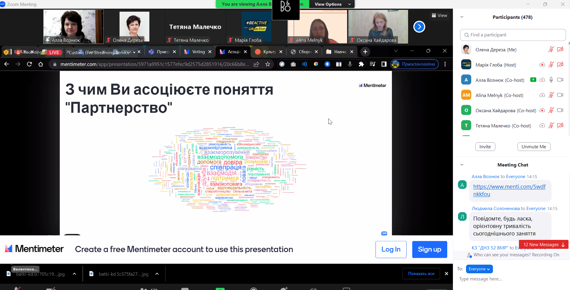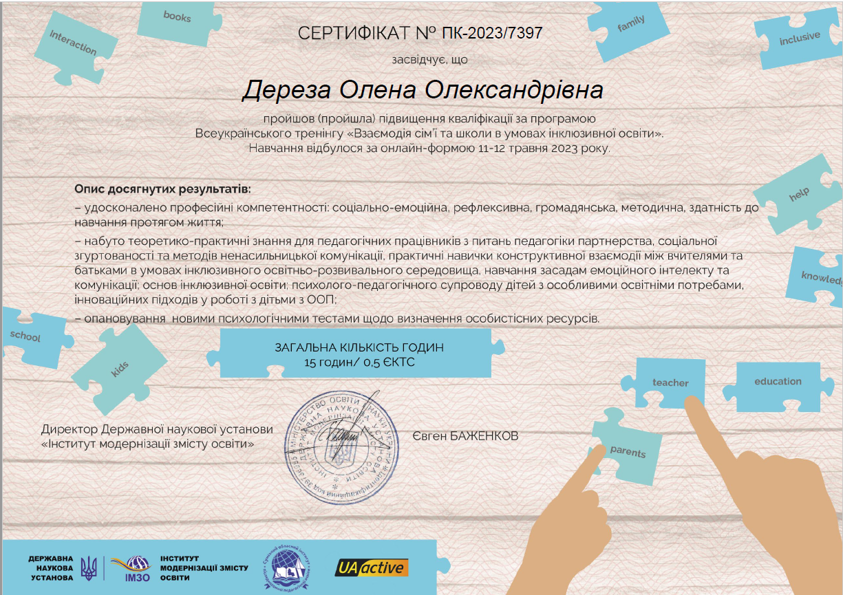11-12 травня 2023 року в онлайновому режимі відбувся Всеукраїнський тренінг «Взаємодія сім’ї та школи в умовах інклюзивної освіти». Організаторами тренінгу є Державна наукова установа «Інститут модернізації змісту освіти», КЗ Сумський обласний інститут післядипломної педагогічної освіти, ГО «Ukraine Active».