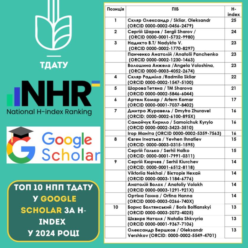 Відповідно до даних NHR, учені ТДАТУ за підсумками 2024 року у Google Scholar за H-index розмістились наступним чином: