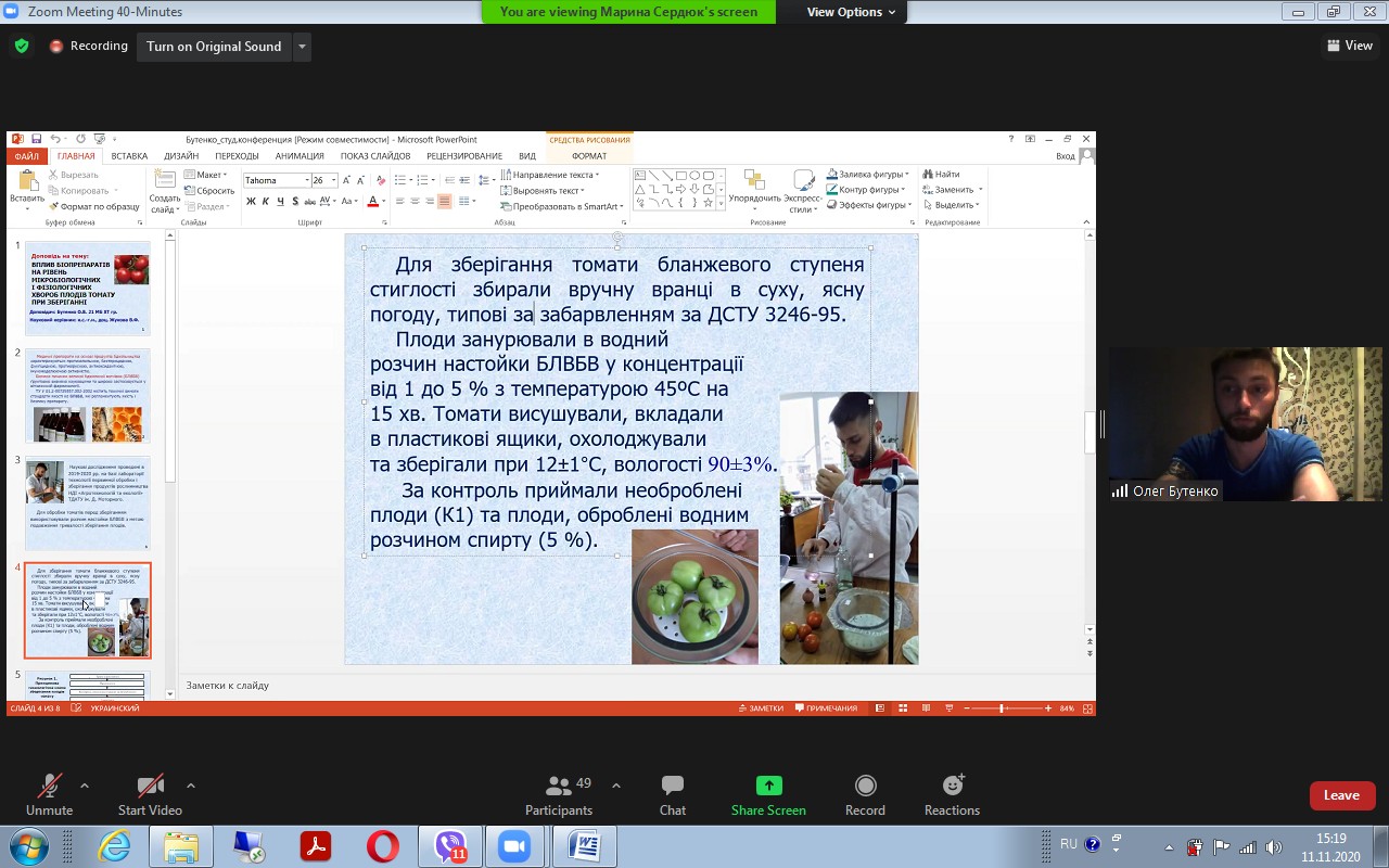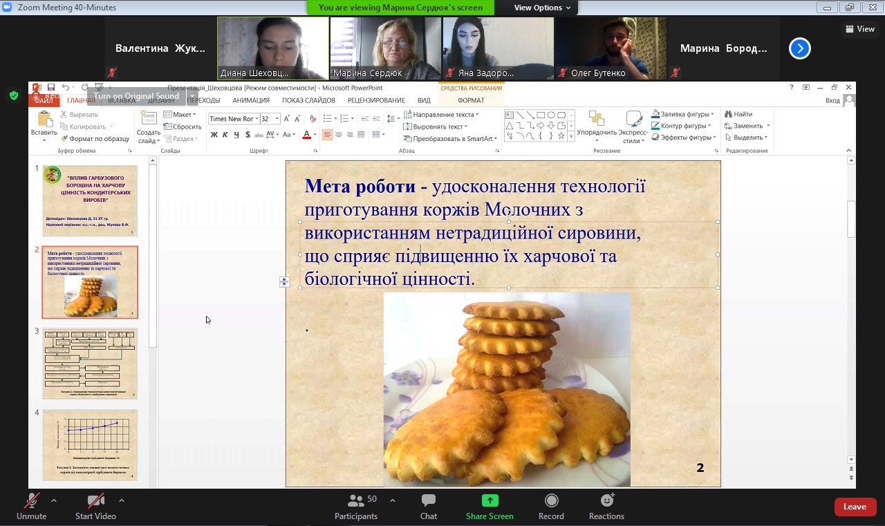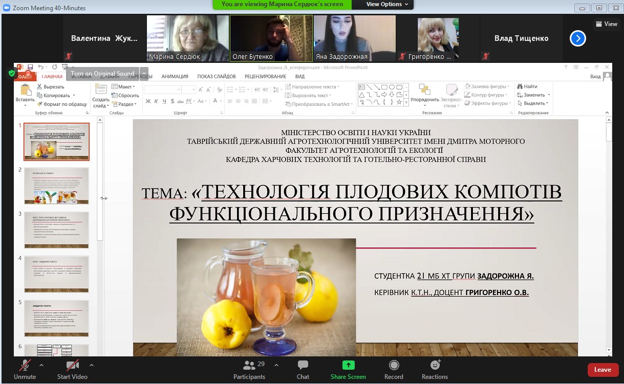 В жорстких умовах пандемії COVID-19 конференція була проведена в online-форматі. Але такий канал комунікації виявився дуже зручним, оскільки вдалося зібратися разом викладачам кафедри ХТ та ГРС, студентам 1-4 курсів, а також магістрам спеціальностей 181 «Харчові технології» та 241 «Готельно-ресторанна справа».
