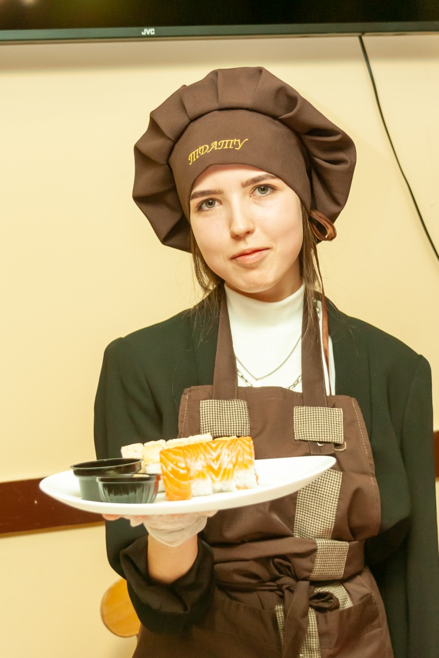 Карина навчається на спеціальності 241 «Готельно-ресторанна справа» за дуальною формою і вже другий семестр вдало поєднує навчання в ТДАТУ імені Дмитра Моторного з навчанням на робочому місці. Вона оволоділа професією сушиста і тепер із задоволенням ділиться своїми знаннями та практичним досвідом. Карина показала присутнім всі нюанси приготування ролів – від правил оцінки якості сировини до тонкощів технологічного процесу. Навички, отримані впродовж майстер-класу, студенти «перевірили на смак» впродовж фінальної дегустації.