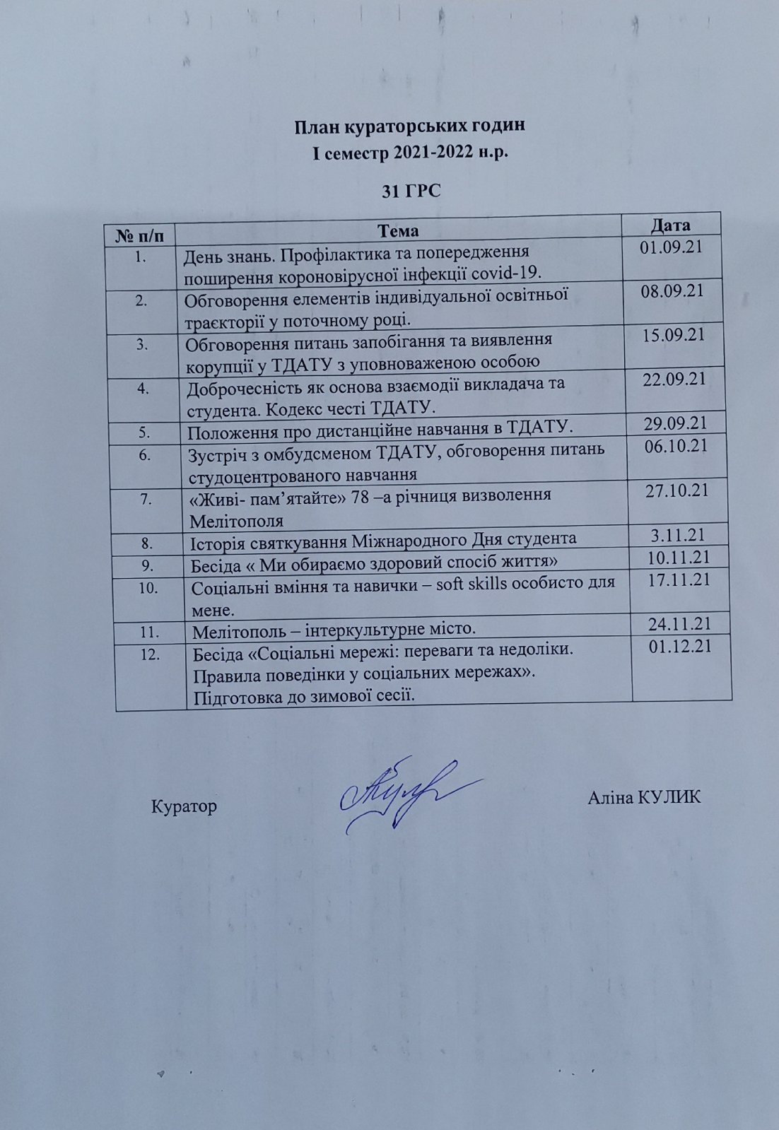 План роботи куратора Кулик А.С. на І семестр 2021-2022 н.р. для 31 ГРС групи