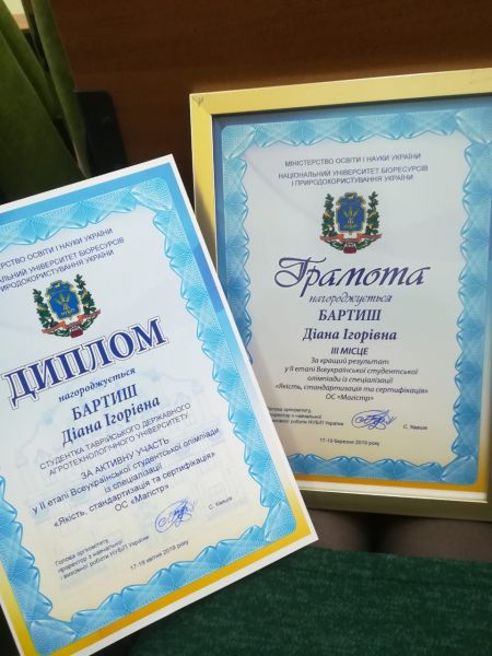 Серед 52 учасників Олімпіади магістри спеціальності «Харчові технології» ТДАТУ Діана Бартиш і Влад Карнаушенко показали міцні знання і були відзначені дипломами та грамотами Міністерства освіти і науки України. Діана зайняла почесне 3 місце, відзначене грамотою та цінним подарунком.