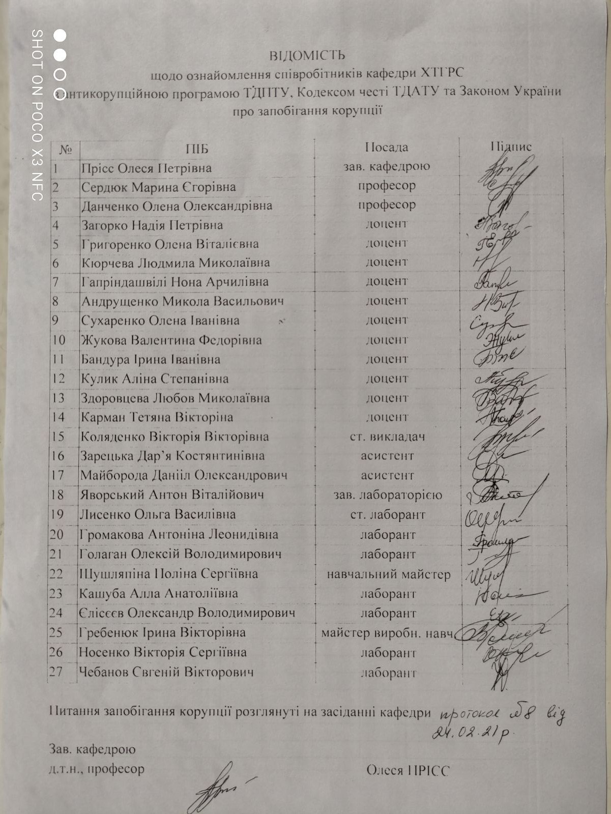 На засіданні кафедри харчових технологій та готельно-ресторанної справи серед професорсько-викладацького складу з метою підвищення інформованості відбулось обговорення положень Антикорупційної програми ТДАТУ імені Дмитра Моторного та норм Закону України «Про запобігання корупції».