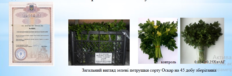 - розроблено технологію зберігання зелені петрушки на основі аграрного гідрогелю та антиоксидантів, що може здійснюватися з використанням існуючого технологічного