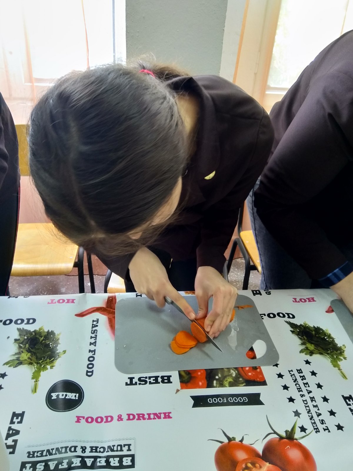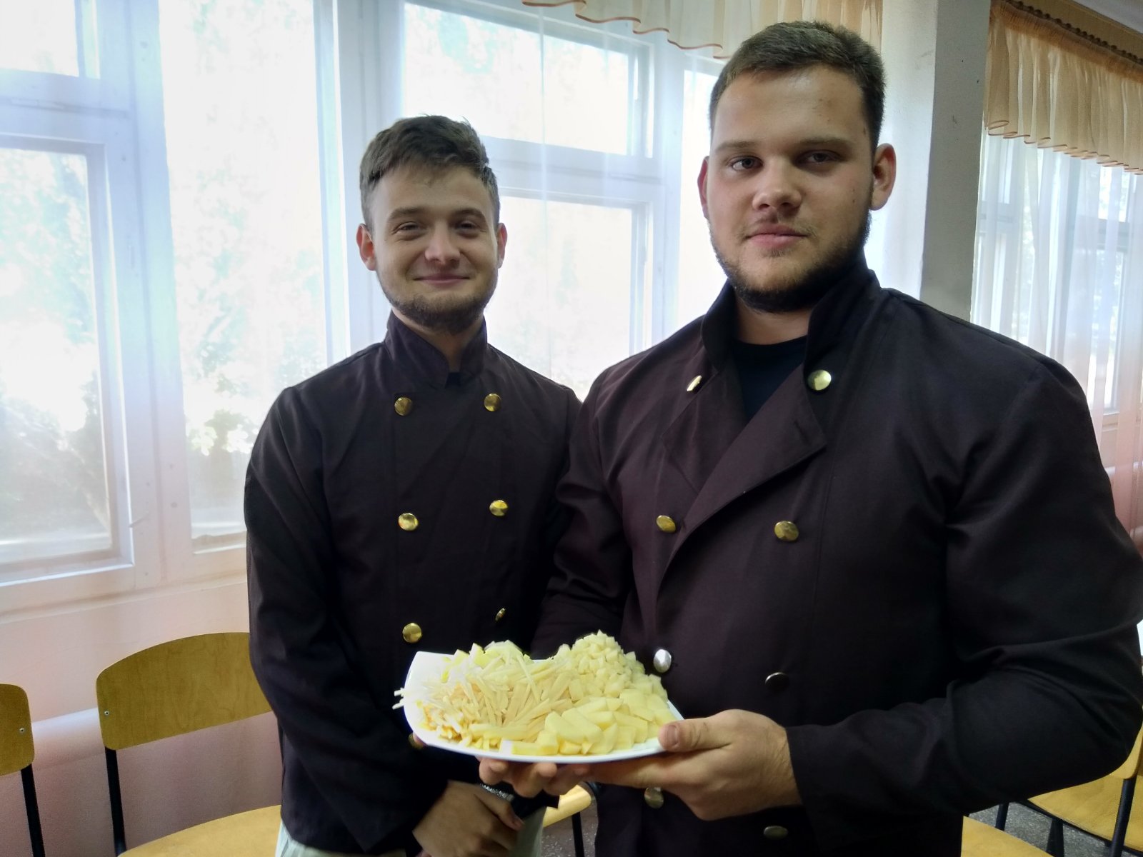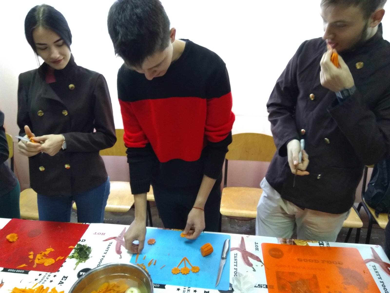 На лабораторному занятті з дисципліни «Технологія продукції ресторанного господарства» студенти 2 курсу спеціальності «Готельно-ресторанна справа» освоювали традиційні прийоми нарізки овочів і фруктів (соломку, брусочки, кубики, часточки, кружечки, шашки, кільця), а також міжнародні види нарізання (брюнуаз, жюльєн, пейзан, шифонад, конкасе та ін.).