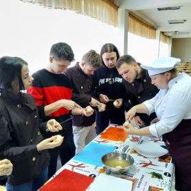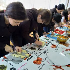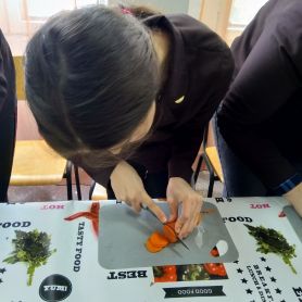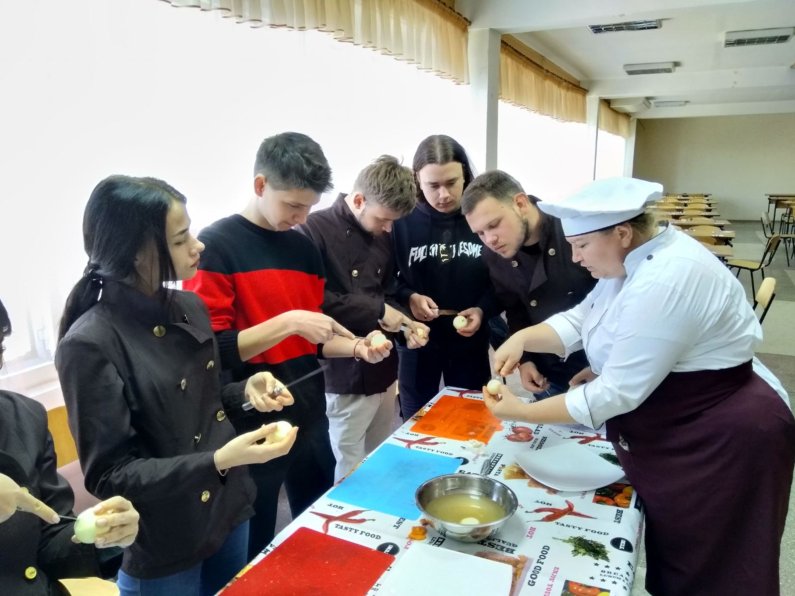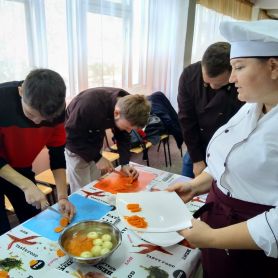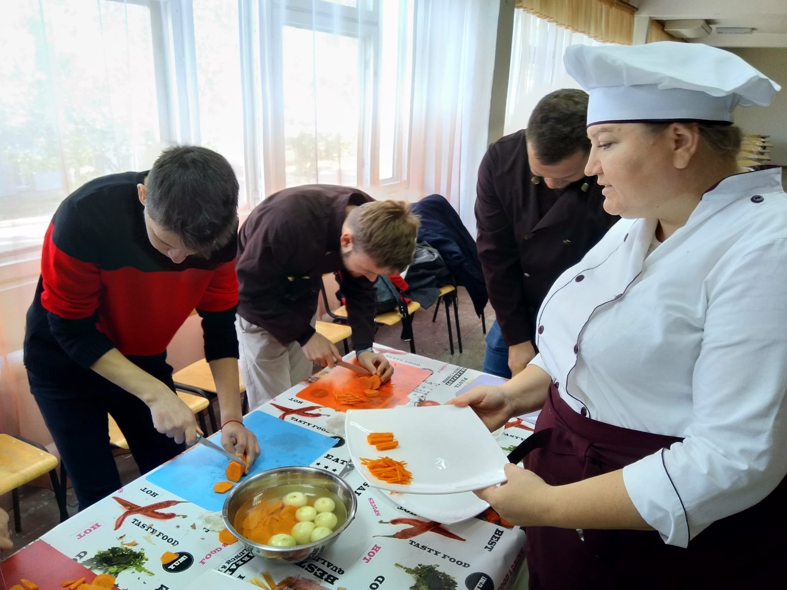 На лабораторному занятті з дисципліни «Технологія продукції ресторанного господарства» студенти 2 курсу спеціальності «Готельно-ресторанна справа» освоювали традиційні прийоми нарізки овочів і фруктів (соломку, брусочки, кубики, часточки, кружечки, шашки, кільця), а також міжнародні види нарізання (брюнуаз, жюльєн, пейзан, шифонад, конкасе та ін.).
