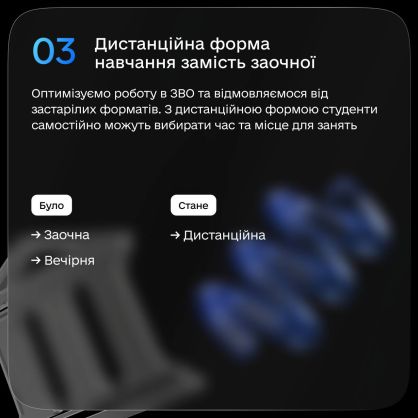 3️⃣ Щоб оптимізувати роботу в ЗВО та провадити ефективний освітній процес, пропонуємо закладам освіти розвивати дистанційну форму навчання. З 2024 року трансформуємо заочну та вечірню форми в дистанційну. Студенти, що нині навчаються на цих формах, зможуть завершити навчання в такому ж форматі, проте з наступного року вступ буде лише на дистанційну або денну форми здобуття освіти.