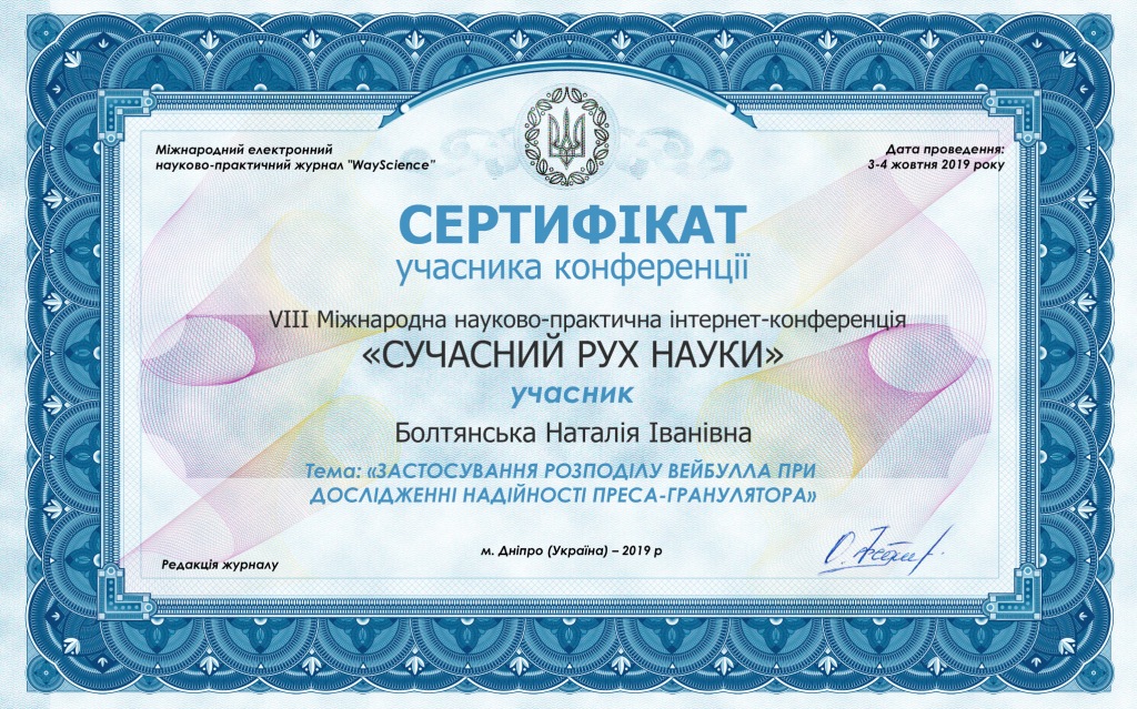 Тематика конференцій охоплює всі розділи Міжнародного електронного науково-практичного журналу «WayScience», а саме: державне управління; філософські науки; економічні науки; історичні науки; юридичні науки; сільськогосподарські науки; географічні науки; педагогічні науки; психологічні науки; соціологічні науки; політичні науки; технічні науки та інші професійні науки. Викладач кафедри ТСС АПК к.т.н., доц. Болтянська Н.І. прийняла участь в конференції в роботі секції технічних наук з доповіддю «Застосування розподілу Вейбулла при дослідженні надійності преса-гранулятора».