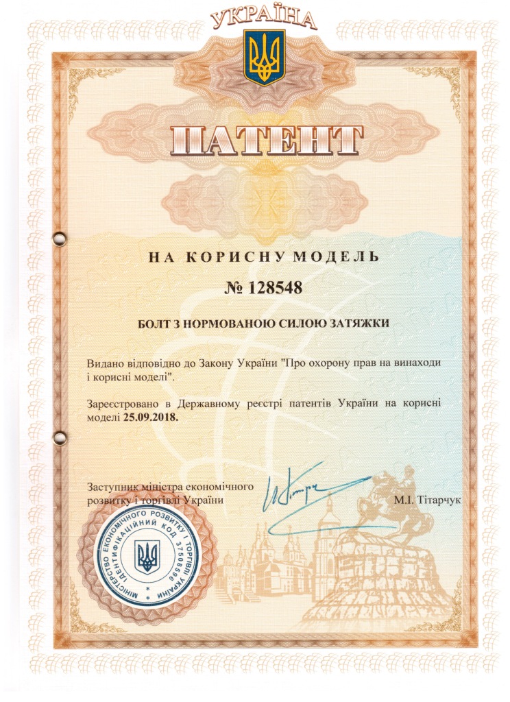 Науковці Таврійського державного агротехнологічного університету намагаючись вирішити проблеми з псуванням та пошкодженням різьби, через прикладені надмірні зусилля при затягуванні болтових з’єднань, розробили спеціальну корисну модель №128548 «Болт з нормованою силою затяжки», винахідники: к.т.н., доц. Сергій Дмитрович Мазілін (кафедра ЦБ), к.т.н., доц. Борис Володимирович Болтянський, к.т.н. Олександр Вікторович Гвоздєв, к.т.н., доц. Сиротюк Сергій Валерійович (завідувач кафедри енергетики ЛНАУ). Патент було розроблено в співавторстві викладача кафедри «Технічний сервіс та системи в АПК», науковців кафедр ТДАТУ та колеги з Львівського НАУ, а корисна модель відповідає тематиці державної програми наукових досліджень лабораторії кафедри ТСС В АПК в 2017-18 навчальному році.