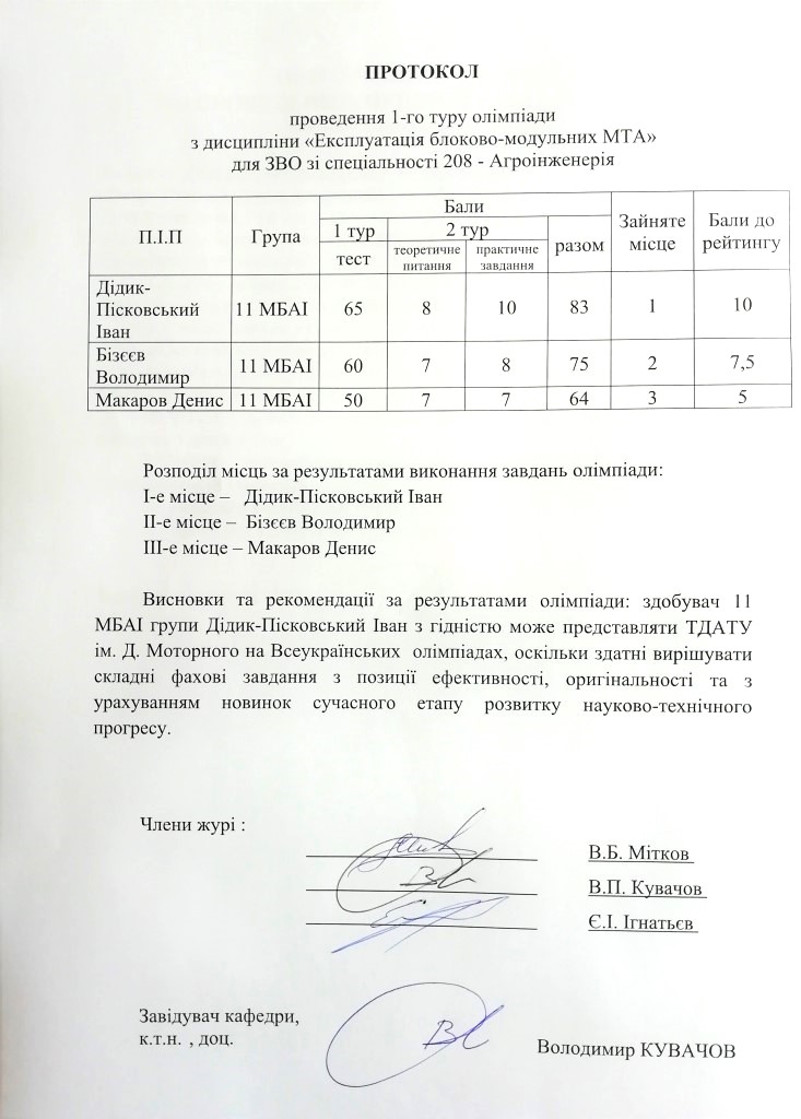 Протокол проведення олімпіади з дисципліни «Експлуатація блоково-модульних МТА» від 20.11.20