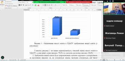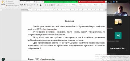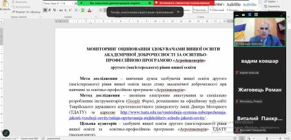 Гарант освітньої програми «Агроінженерія» другого (магістерського) рівня вищої освіти Володимир КУВАЧОВ протягом грудня 2024 року зустрічався із здобувачами магістратури спеціальності 208 Агроінженерія онлайн на платформі Zoom для обговорення результатів згаданого опитування. Під час дискусій зі здобувачами освіти він наголосив на важливості дотримання принципів академічної доброчесності та високо оцінив прагнення студентів до якісної освіти. Володимир КУВАЧОВ також вислухав думки студентів та врахував їх бажання щодо вдосконалення навчального навантаження в наступному навчальному році і популяризації курсів з академічної етики.