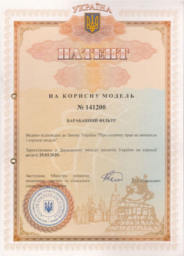 Нещодавно до Таврійського державного агротехнологічного університету імені Дмитра Моторного надійшов сертифікат патенту на корисну модель кандидата технічних наук, професора кафедри технічного сервісу та систем в АПК. Корисна модель №141200 «Барабанний фільтр», винахідники: Олександр Сергійович Коняєв, к.т.н., проф. Олександр Григорович Скляр, Юлія Вікторівна Безверхня.