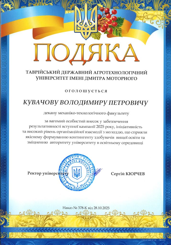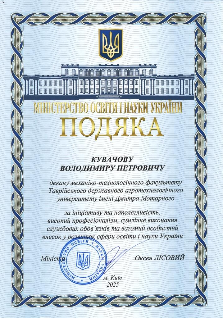 ПОДЯКА Таврійського державного агротехнологічного університету імені Дмитра Моторного, 2025 р.
