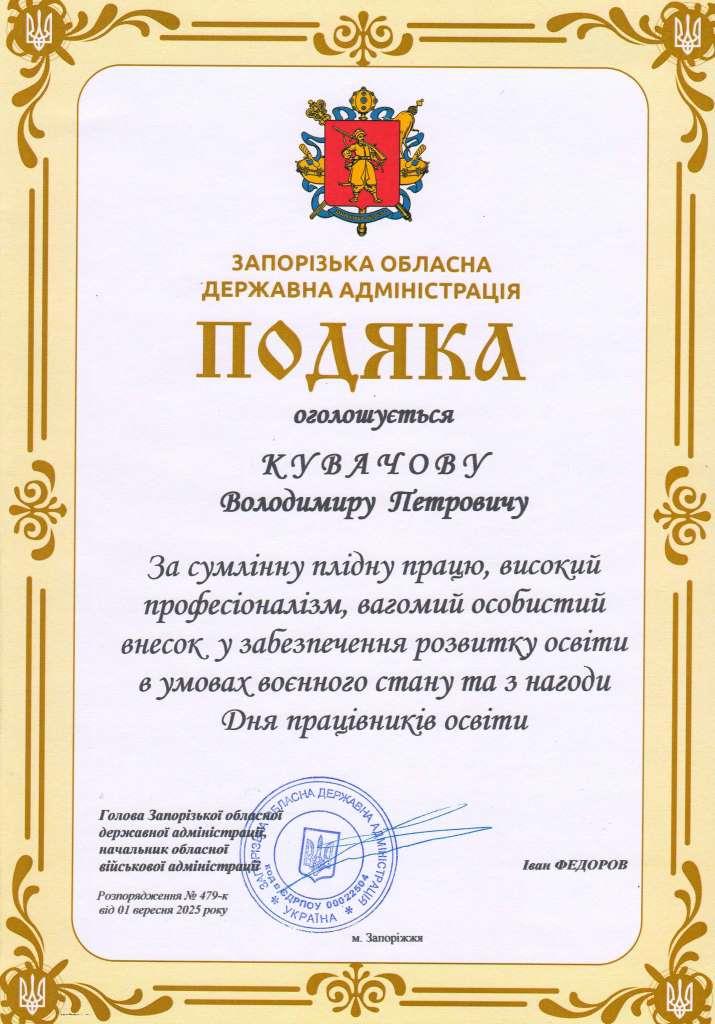 ПОДЯКА Запорізької обласної державної адміністрації, 2025 р.