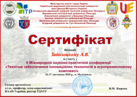 За результатами роботи наукового гуртка «Забезпечення надійності машин і обладнання АПК» в першому семестрі під керівництвом к.т.н., доц. Болтянської Н.І. учасники гуртка Помазан А.С., Заболоцкий А.В. та Вуколов В.І. узагальнили результати своєї роботи та підготували доповіді на ІІ Міжнародну науково-практичну інтернет-конференцію «ТЕХНІЧНЕ ЗАБЕЗПЕЧЕННЯ ІННОВАЦІЙНИХ ТЕХНОЛОГІЙ В АГРОПРОМИСЛОВОМУ КОМПЛЕКСІ». Доповідачі отримали сертифікати учасників конференції. За результатами роботи конференції було сформовано Програму ІІ Міжнародної науково-практичної інтернет-конференції «Технічне забезпечення інноваційних технологій в агропромисловому комплексі», а підготовані тези були опубліковані в Збірнику Матеріалів конференції.