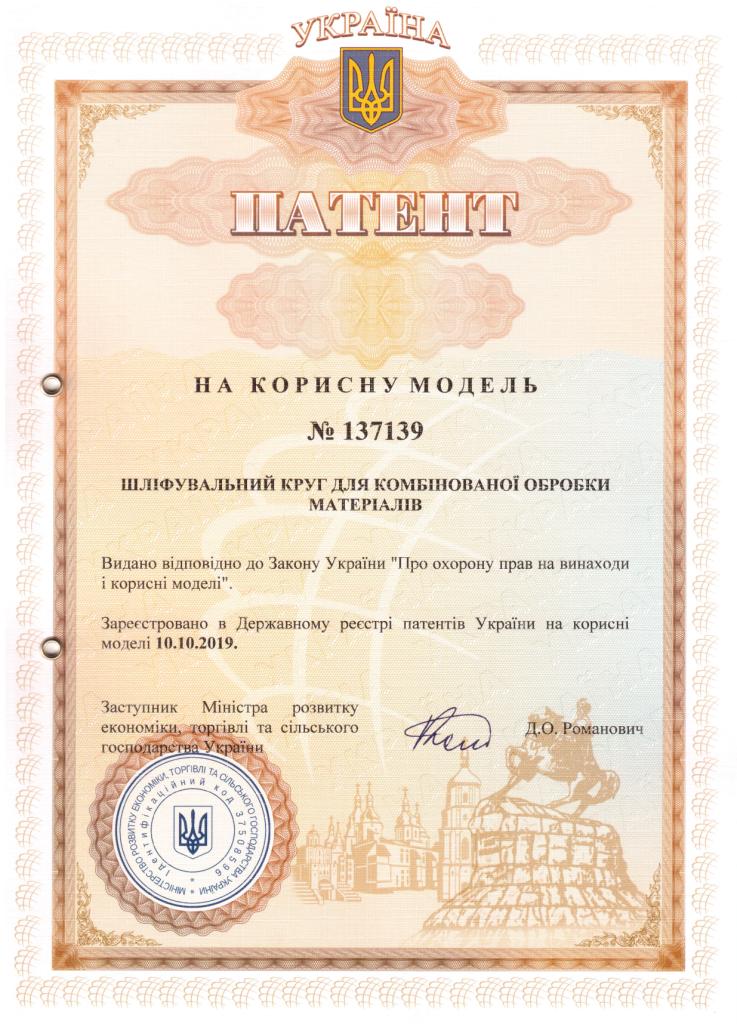 В листопаді 2019 року до Таврійського державного агротехнологічного університету імені Дмитра Моторного надійшов сертифікат патенту на корисну модель викладачів кафедри «Технічний сервіс та системи в АПК». Розробка №137139 «Шліфувальний круг для комбінованої обробки матеріалів», винахідники: к.т.н. Бондар А.М., к.т.н. Петров В.О. (кафедра електроенергетики і автоматизації); д.т.н. Журавель Д.П.; к.т.н. Дашивець Г.І., інж. Новик О.Ю. розробленої в лабораторії кафедри ТСС АПК згідно державної програми наукових досліджень в 2018-19 навчальному році.