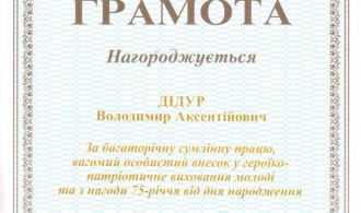 За багаторічну сумлінну працю, вагомий особистий внесок у героїко-патріотичне виховання молоді та з нагоди 75-річчя від дня народження Чернігівська обласна рада в особі голови І.С. Вдовенко нагородила д.т.н., проф. Володимира Аксентійовича Дідура Почесною грамотою! Завідуючому кафедри «Технічний сервіс та системи в АПК» бажаємо наснаги, нових наукових публікацій, міцного здоров’я, творчого натхнення, родинного благополуччя.
