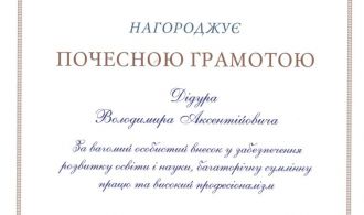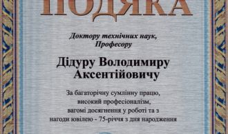 За вагомий особистий внесок у забезпечення розвитку освіти й науки, багаторічну сумлінну працю та високий професіоналізм Кабінет Міністрів України нагородив д.т.н., проф. Володимира Аксентійовича Дідура Почесною грамотою! Бажаємо завідуючому кафедри наснаги, наукових публікацій, міцного здоров’я, творчого натхнення, благополуччя родині.