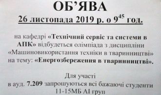 ОБ’ЯВА 26 листопада 2019 року о 9 год. 45 хв. на кафедрі ТСС АПК в аудиторії 7.209 відбудеться олімпіада з дисципліни «Машиновикористання техніки в тваринництві (1 семестр)» для студентів-магістрів 11-15 МБ АІ груп механіко-технологічного факультету на тему: «Енергозбереження в тваринництві». Для участі запрошуються усі бажаючі студенти 11-15 МБ АІ груп.