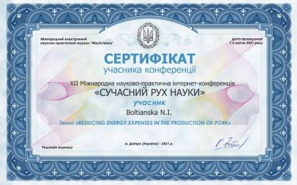 1-2 квітня 2021 року відбулась XII міжнародна науково-практична інтернет-конференція «Сучасний рух науки», яка була присвячена теоретичним та прикладним дослідженням, розробці пропозицій розвитку науки в середовищі загроз та нових викликів. Співробітники кафедри ТСС АПК доц., к.т.н. Болтянська Н.І., та доц., к.т.н. Болтянський Б.В. взяли участь в конференції з доповідями. Матеріали доповідей були опубліковані в Міжнародному електронному науково-практичному журналі «WayScience». Місія цього журналу – прокласти шлях розвитку сучасної науки від ідеї до результату. Його завданнями є генерація інноваційних ідей; розповсюдження інформації щодо передових досліджень в міжнародному масштабі; формування наукової платформи для розвитку молодого покоління вчених; сприяння розвитку наукової дискусії.