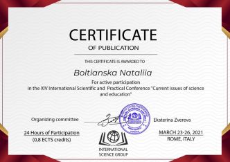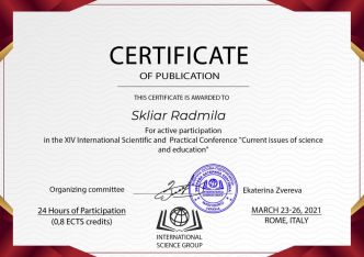 Науково-педагогічні працівники кафедри ТСС АПК регулярно приймають участь в роботі наукових конференцій, де представляють свої наукові здобутки. 23–26 березня 2021 р. в місті Рим (Італія) було проведено XIV-ту Міжнародну науково-практичну конференцію «Current issues of science and education». Участь в конференції прийняли професор Скляр О.Г., доцент Болтянська Н.І. та доцент Скляр Р.В. За результатами роботи було сформовано Збірник Матеріалів конференції, всі учасники отримали сертифікати.