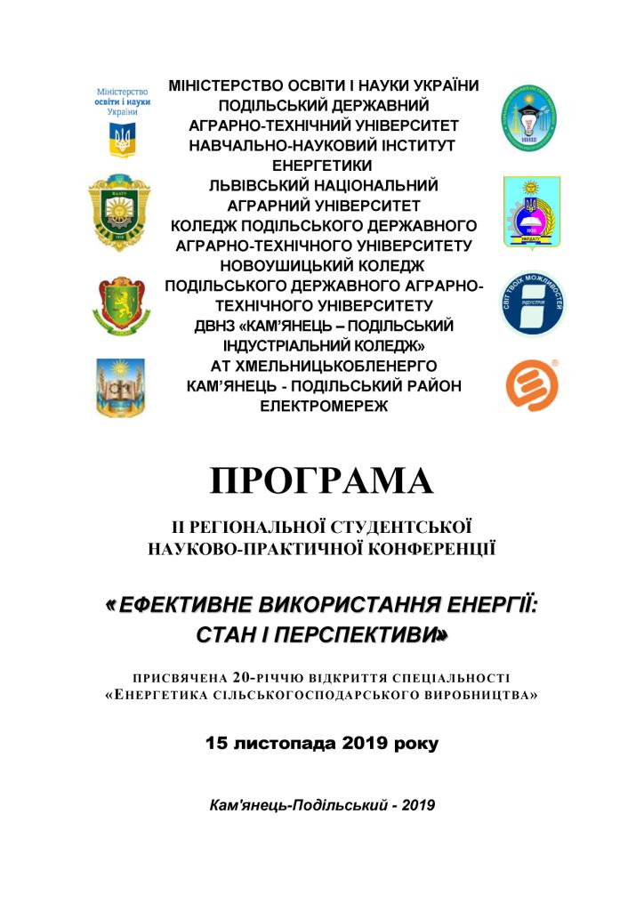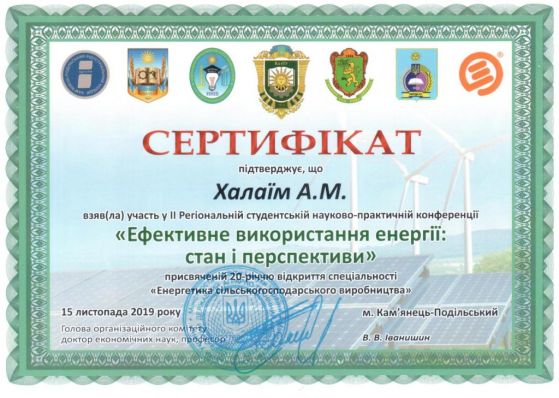 21 листопада 2019 року за ініціативи Міністерства освіти і науки України, Подільського державного аграрно-технічного університету Навчально-наукового інституту енергетики Львівського національного аграрного університету, коледжу Подільського державного аграрно-технічного університету, Новоушицького коледжу Подільського державного аграрно- технічного університету, ДВНЗ «Кам’янець – Подільський індустріальний коледж» АТ Хмельницькобленерго Кам’янець – Подільського району електромереж на базі Подільського державного аграрно-технічного університету було проведено ІІ Регіональну студентську науково-практичну конференцію «ЕФЕКТИВНЕ ВИКОРИСТАННЯ ЕНЕРГІЇ: СТАН І ПЕРСПЕКТИВИ», присвячену 20-річчю відкриття спеціальності «ЕНЕРГЕТИКА СІЛЬСЬКОГОСПОДАРСЬКОГО ВИРОБНИЦТВА». За результатами роботи студентського наукового гуртка «Забезпечення надійності машин і обладнання АПК» (План роботи наукового гуртка), що працює під керівництвом доц. к.т.н. Болтянської Н.І. підготували доповіді та прийняли участь в роботі даної конференції здобувачі вищої освіти Халаїм А.М., 21 МБ ГМ, Волков О.Ю., 21 МБ ГМ, та Мельников В.Я., 21САІ і були нагороджені відповідними сертифікатами.