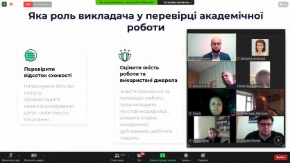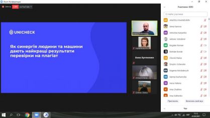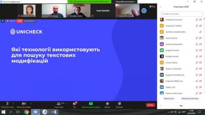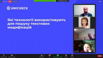 22 квітня 2021 року співробітники кафедри ТСС АПК доцент Скляр Р.В. та доцент Болтянська Н.І. взяли участь в роботі вебінару про аналіз звіту подібності від Unicheck Україна. Захід пройшов за участі та підтримки проєкту «Ініціатива академічної доброчесності та якості освіти» – Academic IQ. Під час роботи було розглянуто основні аспекти звіту подібності, який формується після перевірки роботи на плагіат та практичні кейси та найцікавіші запитання про перевірку тексту на плагіат та академічну доброчесність в університеті. Детально зупинились на основних аспектах користування сервісом Unicheck, які допоможуть розібратись з видами облікових записів сервісу, використанням наявних сторінок університету для перевірки робіт на плагіат, видами текстових модифікацій та багато іншого.
