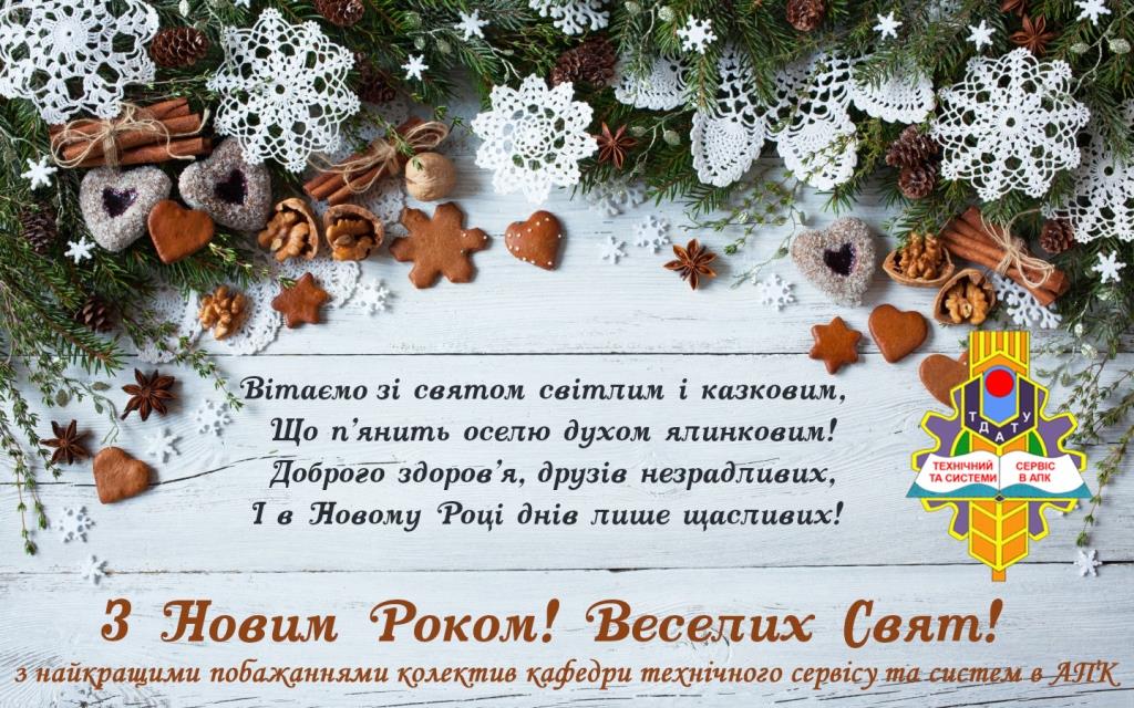 Колектив кафедри технічного сервісу та систем в АПК щиро вітає всіх з Новим роком. Сьогодні, в останній день року, висловлюємо слова вдячності нашим колегам за самовіддану працю упродовж непростого 2021 року. Бажаємо, щоб у наступному році в кожного з Вас було вдосталь сил та бадьорості втілювати свої мрії, сміливо рухатись до своїх задумів, впевнено зустрічати перепони і бачити у них можливості та головне – Вам і Вашим родинам міцного здоров’я, яке є запорукою такого простого людського щастя! Усім Вам бажаємо наснаги, позитивних думок та міцного імунітету від викликів часу. Віримо, що спільними зусиллями цілком реально втілити у життя новорічні побажання.