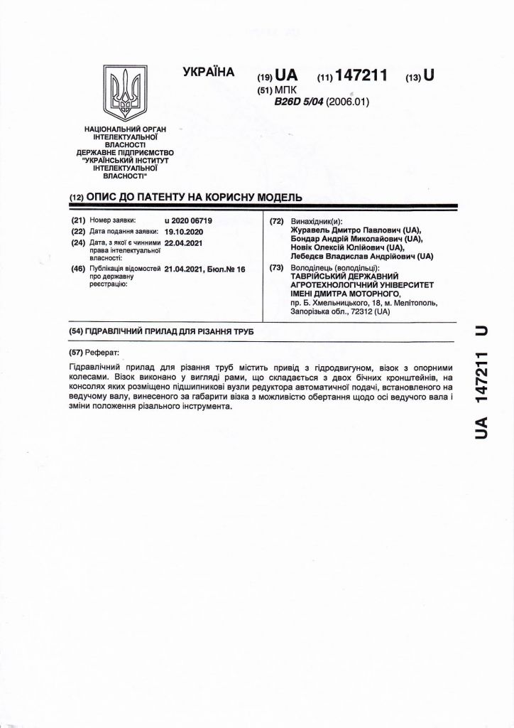 Вітаємо з отриманням сертифікату патенту на корисну модель «Гідравлічний прилад для різання труб»