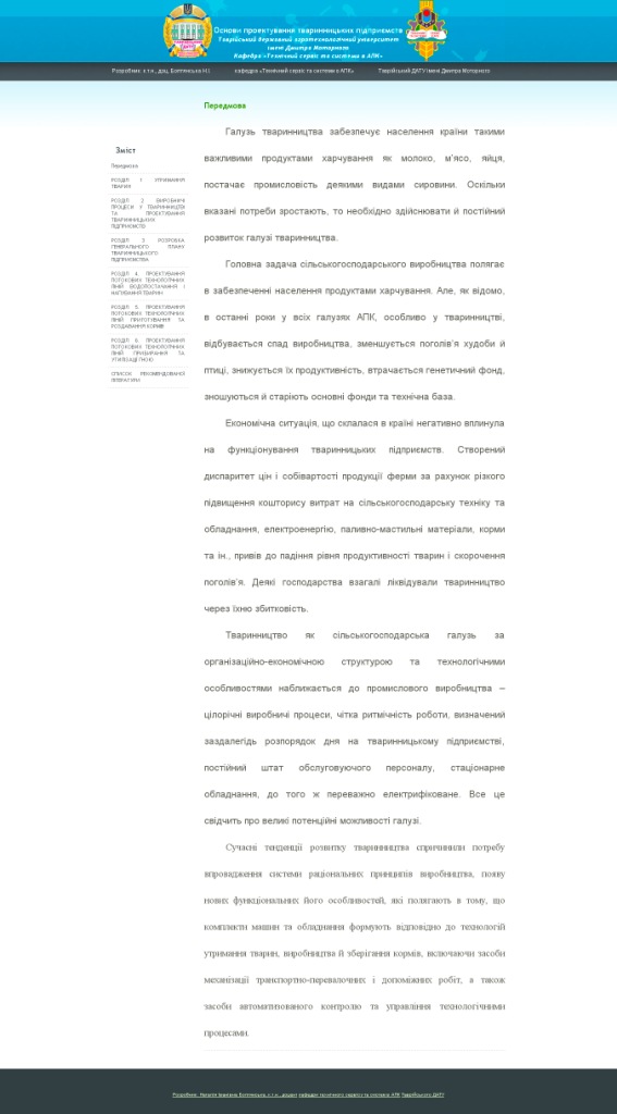 Вітаємо з виходом у світ електронного підручника «Основи проектування тваринницьких підприємств» розробленого к.т.н., доц. Болтянською Н.І. з метою підвищення якості освітнього процесу здобувачів ступеня вищої освіти, з інформацією якого можна ознайомитись в розділі Електронні посібники викладачів кафедри «Технічний сервіс та систем в АПК» за наступним посиланням ПЕРЕЙТИ ДО ПЕРЕГЛЯДУ ПІДРУЧНИКА.