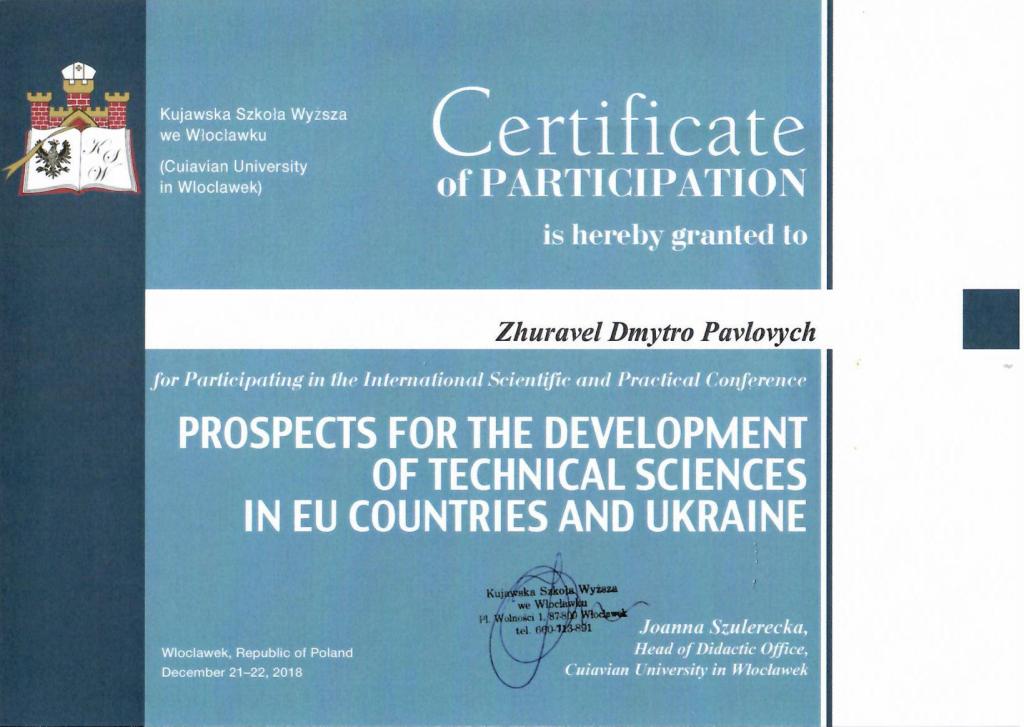 З 21 по 22 грудня 2018 року в м. Влоцлавек, Республіка Польща, відбулась Міжнародна науково-практична конференція «Проекти розвитку технічних наук у країнах ЄС та Україні». Кафедру технічного сервісу та систем в АПК на міжнародному заході представляли викладачі, наукова діяльність та інтереси яких пов’язані з технічним сервісом в сільськогосподарському виробництві, а саме: д.т.н., доц. Дмитро Павлович Журавель, к.т.н., ст. викл. Андрій Миколайович Бондар, що виступили з темою доповіді «Оцінка ефективності технічного рівня ґрунтообробних мотоблоків».