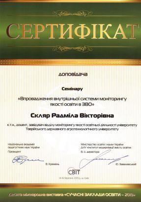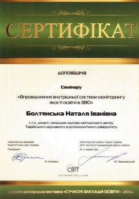 В рамках Десятої міжнародної виставки «Сучасні заклади освіти» був проведений семінар «Впровадження внутрішньої системи моніторингу якості освіти в закладах вищої освіти» в якому прийняли участь викладачі кафедри технічного сервісу та систем в АПК: к.т.н., доц. Наталія Іванівна Болтянська, к.т.н., доц. Радміла Вікторівна Скляр і за результатами його роботи отримали сертифікати.