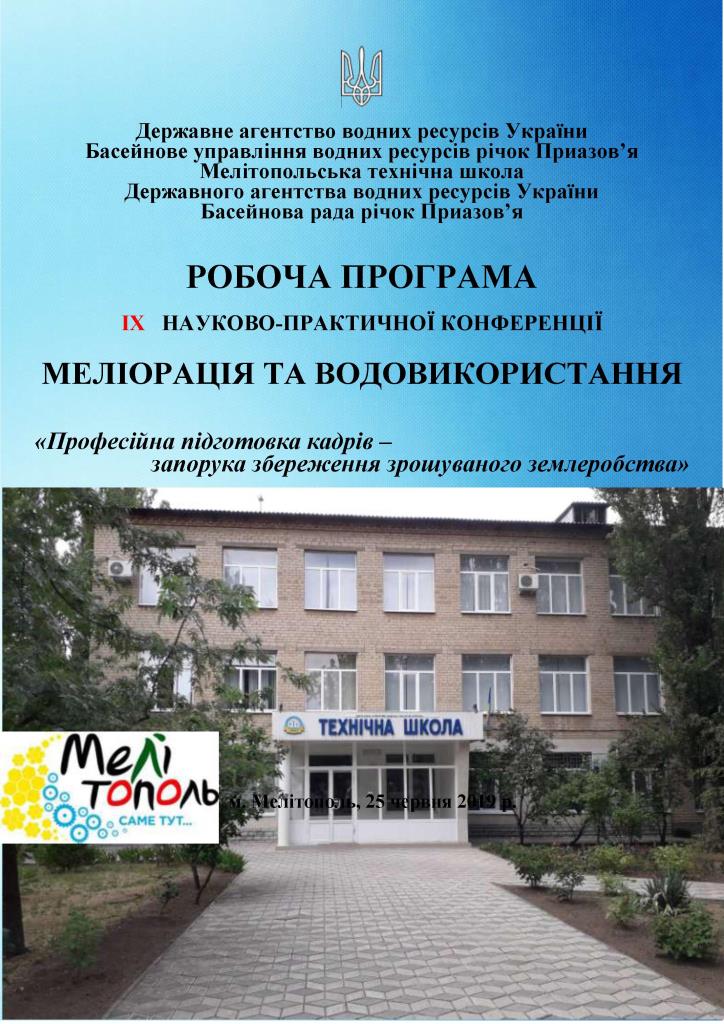 25 червня 2019 року за ініціативи Державного агентства водних ресурсів України, Басейновового управління водних ресурсів річок Приазов’я, Мелітопольської технічної школи, Державного агентства водних ресурсів України та Басейнової рада річок Приазов’я проводилась ІХ науково-практична конференція «Меліорація та водовикористання»: професійна підготовка кадрів – запорука збереження зрошуваного землеробства. В роботі конференції прийняли участь викладачі кафедри технічного сервісу та систем в АПК: Дереза С.В. з доповіддю «Нестача питної води в посушливих регіонах України» та Болтянська Н.І. з доповіддю «Вода і водні ресурси в технологічних процесах підприємств АПК»
