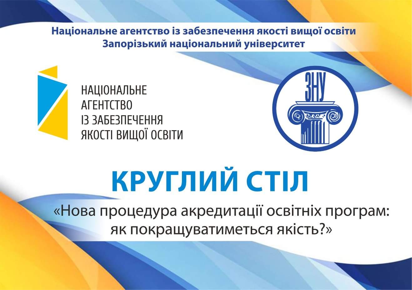 22 жовтня 2019 року в Запорізькому національному університеті відбувся круглий стіл «Нова процедура акредитації освітніх програм: як покращуватиметься якість?» за участю Національного агентства із забезпечення якості вищої освіти.