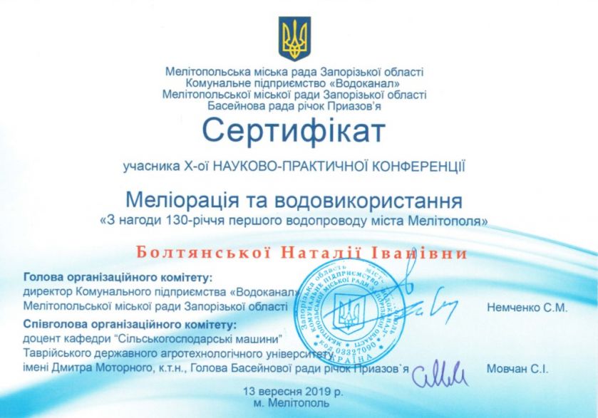 13 вересня 2019 року під егідою Мелітопольської міської ради Запорізької області, Комунального підприємства «Водоканал», Мелітопольської міської ради Запорізької області, Басейнової ради річок Приазов’я з нагоди 130-річчя водопроводу міста Мелітополя проводилась Х-та науково-практична конференція «Меліорація та водовикористання», в якій з доповідями прийняли участь викладачі кафедри технічного сервісу та систем в АПК: Дереза С.В., Болтянський Б.В. та Болтянська Н.І.