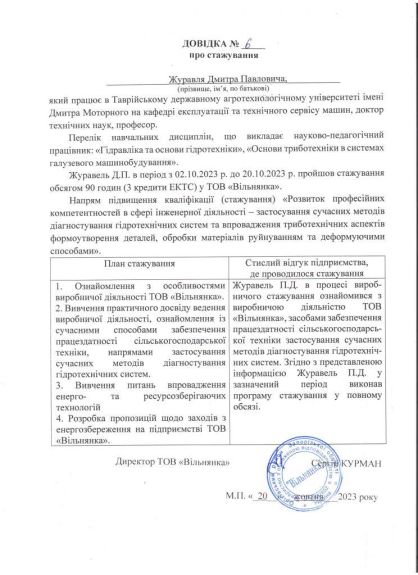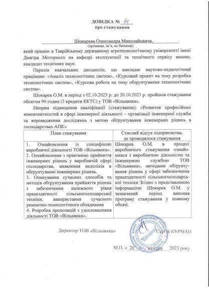 Так, протягом трьох тижнів (з 2 до 20 жовтня 2023 р.) згідно наказу по університету № 380-ІПК від 02.10.2023 р. співробітники кафедри ЕТСМ проходили виробниче стажування в одному з найбільш потужних аграрних підприємств південно-східного регіону нашої країни – товаристві з обмеженою відповідальністю «Вільнянка» Оріхівського району Запорізької області.