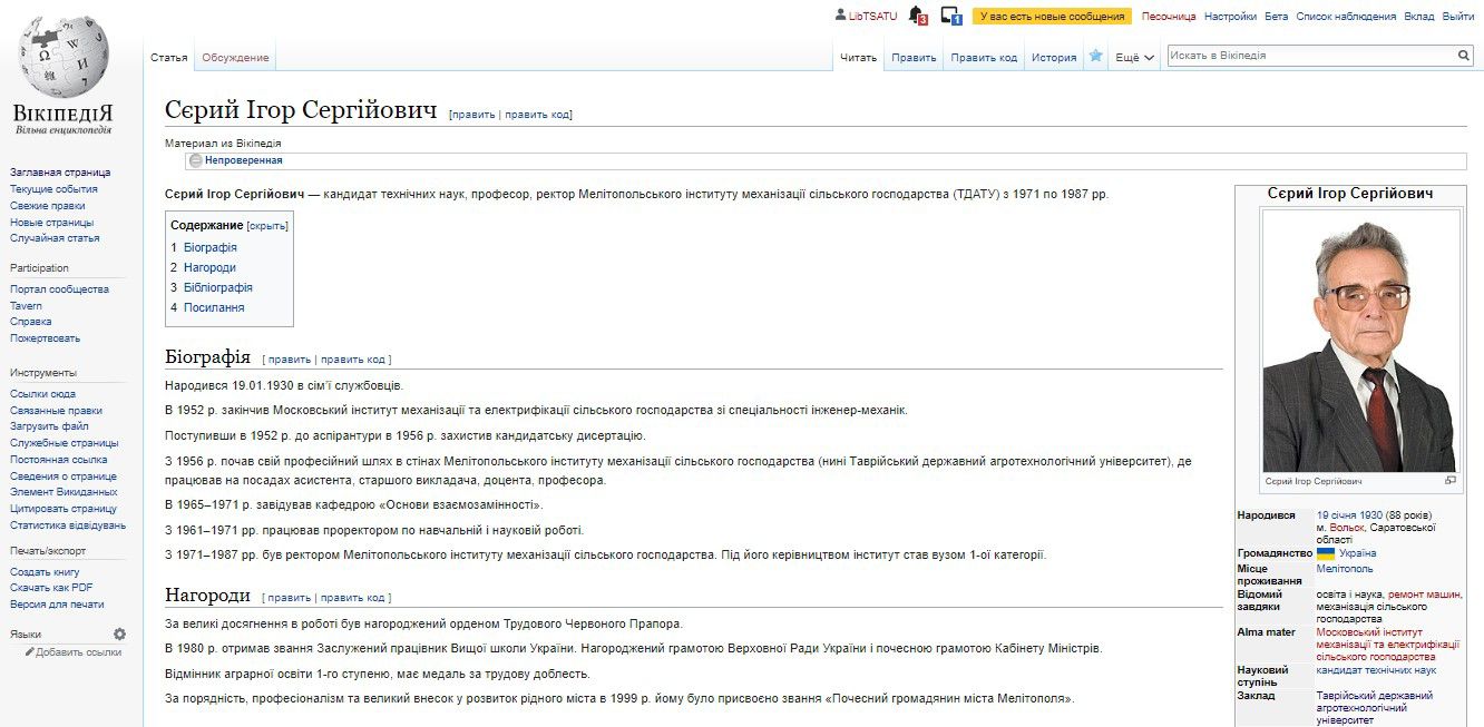 З біографіями професорів кафедри ТСС в АПК відтепер можливо ознайомитися в електронній енциклопедії «Вікіпедія»