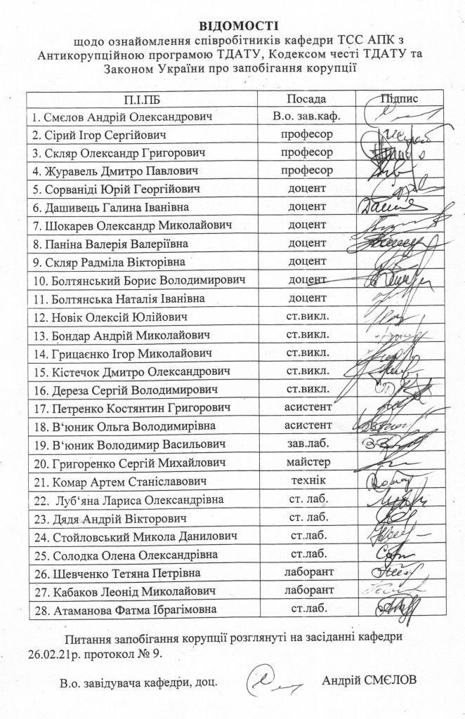 26 лютого відбулось засідання кафедри технічного сервісу та систем в АПК, на якому обговорювалась «Антикорупційна програма ТДАТУ» та Закон України «Про запобігання корупції». на засідання були запрошені перший проректор, професор Скляр О.Г. та проректор з науково-педагогічної роботи, доцент Ломейко О.П., які наголосили на тім, що якість вищої освіти України є необхідною умовою розвитку країни. Якість професійної підготовки фахівців є однією з вимог до вітчизняної вищої освіти, що прагне інтеграції у європейський освітній простір. Саме від якості людських ресурсів залежить рівень конкурентоспроможності випускників вишів на ринку праці України та країн ближнього та далекого зарубіжжя.