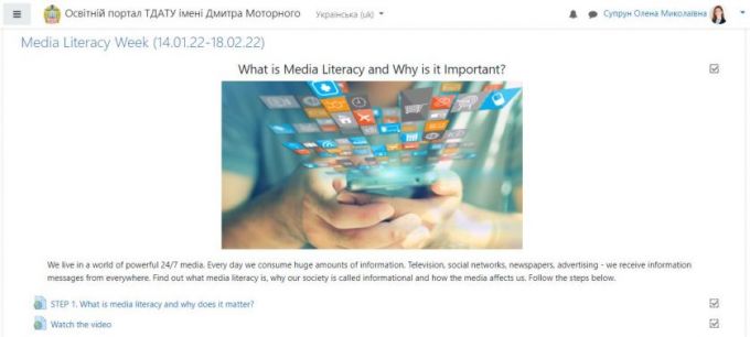 Протягом цього тижня студенти Таврійського державного агротехнологічного університету імені Дмитра Моторного мали змогу взяти участь у заході «Тиждень медіаграмотності», який проводила старший викладач кафедри іноземних мов Олена Супрун. Вона пройшла курс для вчителів медіаграмотності та отримав знання та навички з предмета.