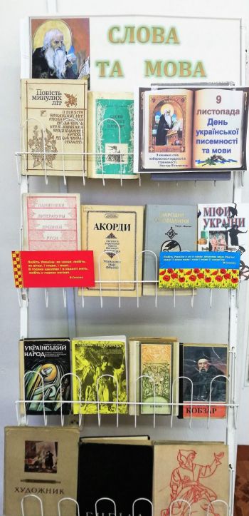 До дня української писемності та мови наукова бібліотека презентує експрес-виставку «Слова та мова». На виставці представлені книги, які є знаковими в історії розвитку української словесності та писемності: «Повість минулих літ», «Слово о полку Ігореве», «Міфи України», «Народні оповідання», «Український народ у своїх легендах, релігійних поглядах та віруваннях» та інші.