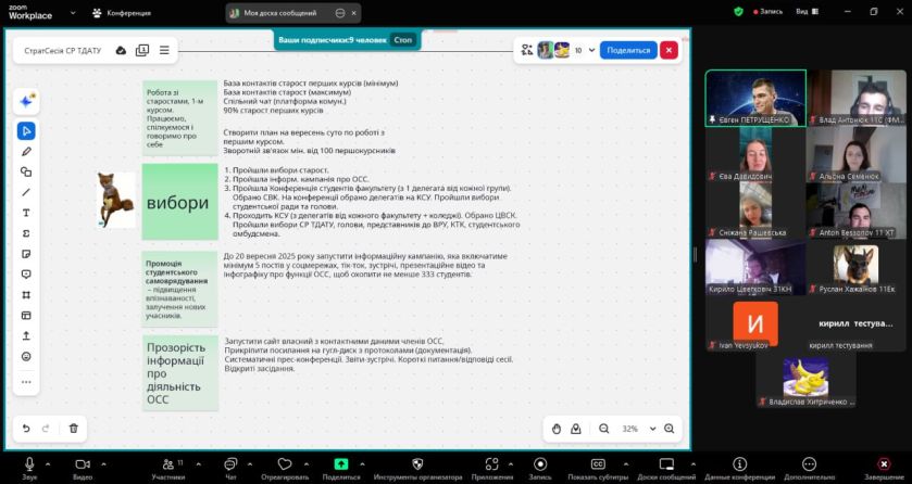 Зустріч відбулася в онлайн-форматі та об’єднала членів Студентської ради. Упродовж 5 годин учасники працювали над ключовими питаннями, що визначатимуть події в студентському самоврядуванні у вересні–жовтні 2025 року.