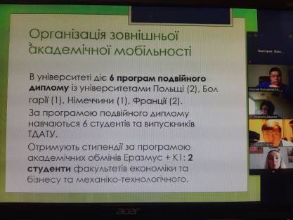 Проектор з НР та МД Володимир Надикто доповів про спільні наукові дослідження. В цьому питанні у ТДАТУ є чіткий алгоритм: пошук закордонних партнерів, аналіз їх наукової діяльності, запрошення до співпраці. До речі, спілкуватися та залучати партнерів можна і в умовах карантину. Проаналізувати їхню наукову діяльність можна за допомогою Google Academy, Scopus, Wos та безпосередньо на сайтах ЗВО, а безпосереднє спілкування здійснювати за допомогою онлайн-сервісів.