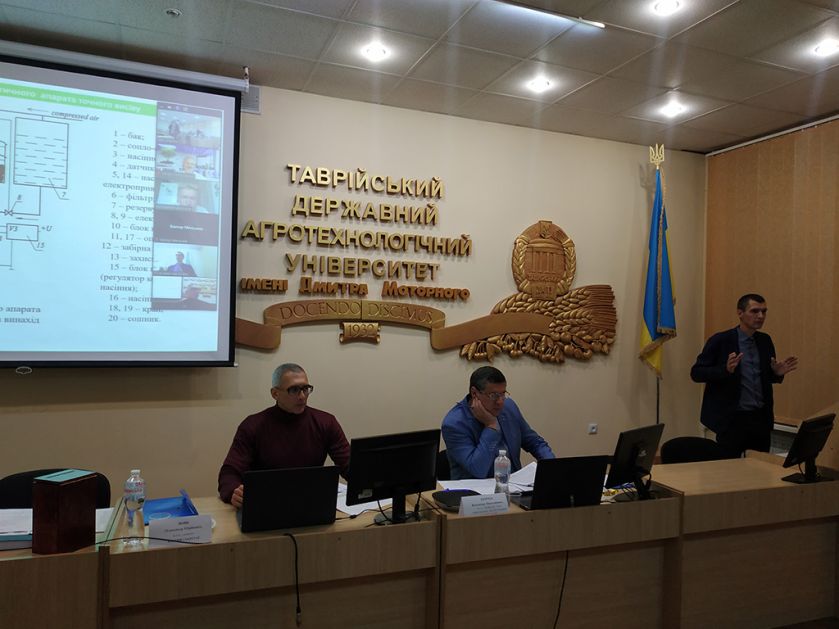 На цьому засіданні проходив прилюдний захист дисертаційної роботи старшого викладача кафедри тракторів і сільськогосподарських машин Дніпровського державного аграрно-економічного університету Владислава Бойка. Дисертація виконана на актуальну тему «Обґрунтування конструктивно-технологічних параметрів гідропневматичного апарата точного висіву насіння овочевих культур» і подана автором на здобуття наукового ступеня кандидата технічних наук зі спеціальності 05.05.11 – машини і засоби механізації сільськогосподарського виробництва.