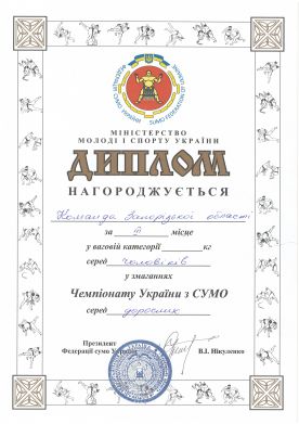 Протягом 15 років національна збірна команда України з сумо входить у трійку світових лідерів. Федерація сумо України створена у 1999 році, офіційного зареєстрована у 2001 році. У 2003 році СУМО офіційно було визнано як вид спорту в Україні. Сумо входить до програм Всесвітніх Ігор та Всесвітніх Ігор з єдиноборств.