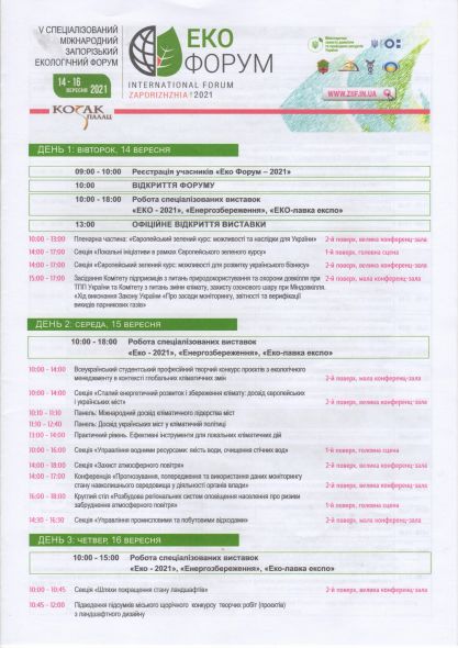Запорізькою міською радою спільно з Міністерством енергетики та захисту довкілля України, Міністерством освіти і науки України, Запорізькою торгово-промисловою палатою, провідними підприємствами та громадськістю регіону з 14 по 16 вересня у Запоріжжі, на базі сучасного виставкового комплексу «Козак-Палац», проведено міжнародний екологічний форум «Еко Форум – 2021».