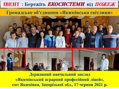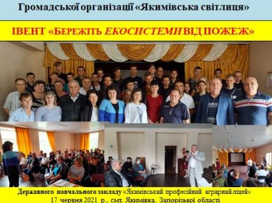 У рамках Програми ООН із відновлення та розбудови миру Приазовського регіону у напрямку громадської безпеки за підтримки Якимівської селищної ради та ГО «Якимівська світлиця» на базі Якимівського професійного аграрного ліцею відбувся івент «Бережіть екоситеми від пожеж». Головна мета заходу полягала в популяризації екологічно-свідомого підходу до ведення сільськогосподарської діяльності, збереження ресурсів рідного краю та протидії надзвичайним ситуаціям.