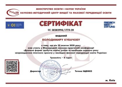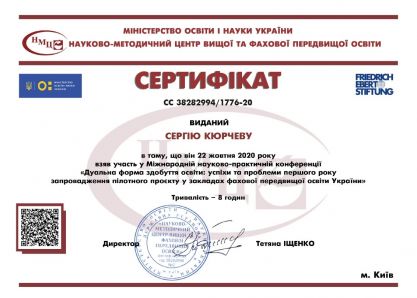 З метою вивчення проблем упровадження підготовки фахівців за дуальною формою в закладах освіти, передового досвіду та механізмів ефективного упровадження підготовки фахівців, імплементації Концепції дуальної освіти в освітній процес, декан факультету професор Сергій Кюрчев та завідувач випускової кафедри машиновикористання в землеробстві Володимир Кувачов взяли участь у Міжнародній науково-практичній конференції «Дуальна форма здобуття освіти: успіхи та проблеми першого року запровадження пілотного проєкту у закладах вищої та фахової передвищої освіти України». Конференція відбулася 22 жовтня 2020 р. у Науково-методичному центрі ВФПО. Напрями роботи конференції були такі: