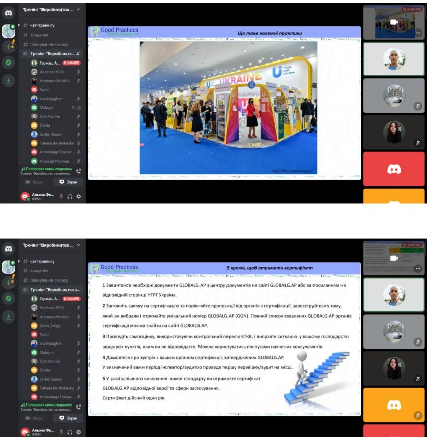 Тренінг проходив на платформі Discord, спікером був експерт з впровадження сталих практик управління, кваліфікований сільськогосподарський дорадник/ Виробництво рослинницької продукції за вимогами стандарту Global G.A.P V5.2 Андрій Гармаш.